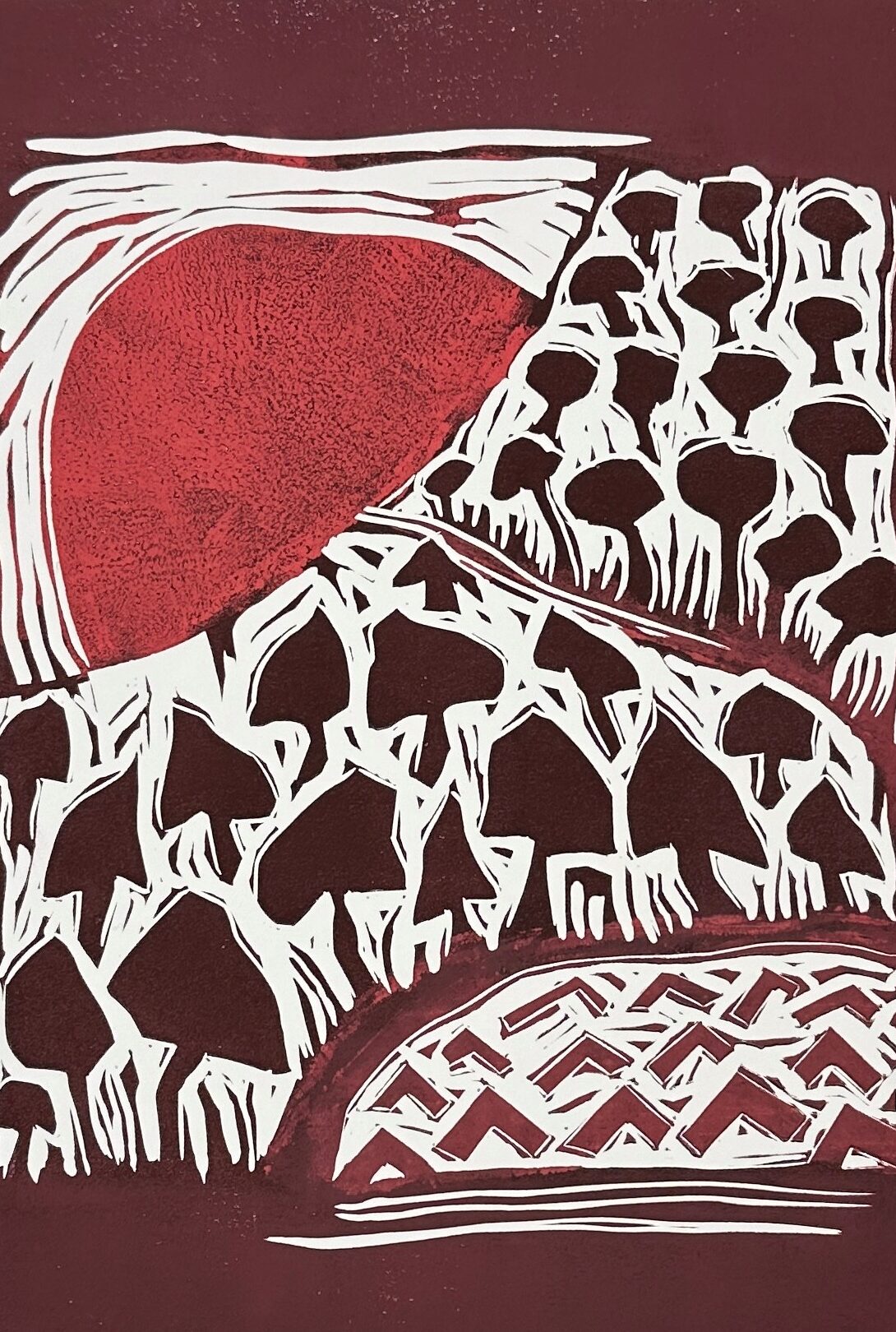 Image Credit: Dave Skilling, Hillside Hike II, monoprint, 19.25 x 26.25″, framed, $1100.